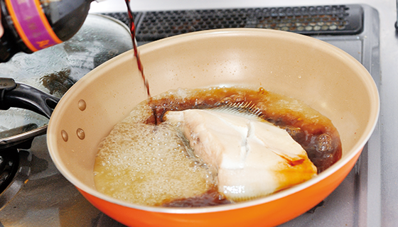 煮魚のレシピは、多くが「すべての調味料を煮立て、魚を入れ、落とし蓋をして煮る」というものだ。今回お伝えする煮魚の作り方は、それとはまったく違う。まずは、フライパンに酒を沸騰させ、魚を入れ、砂糖を入れる。ここで酒蒸しにしながら魚の細胞を緩めるわけだ。ある程度火が通ったら、次に醤油、みりんを入れて仕上げていく。細胞を締めるから、魚に入った味を閉じ込めることができる(カレイの煮つけの作り方は下を参照)。
