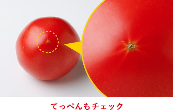 まずは、色が鮮やかで艶、ハリがあるかを確認。ヘタがいきいきとした緑色か、切り口がみずみずしいかどうかが鮮度のポイントです。また、ヘタの反対側もチェック。てっぺんから白い線が放射状に伸びているものを選びましょう。丸みがありずっしりと重量感のあるものが中身が詰まったトマトです。