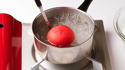 トマトはヘタをくりぬき、反対側に十文字の切り込みを浅く入れる。鍋に湯を沸かし、トマトを網じゃくしなどにおいて、1個ずつ浸ける。皮がはじけてきたらすぐに冷水に浸けて皮をむく。