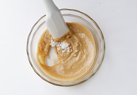ゴマだれを作る。練りごまはゴムベラなどでなめらかにし、砂糖を入れてよく混ぜる。みりん、しょうゆを順に加えながら混ぜる。