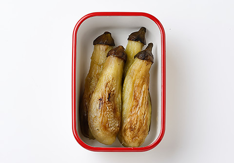 なすはヘタに包丁でぐるりと切り目を入れ、ガクをとる。強火のグリルか焼き網で8~10分焦げ目がつくまで焼く。さっと水に通し、熱いうちに皮をむく。