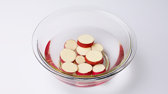 さつまいもの天ぷらや煮物の仕上がりをきれいにする下準備。切ったままにしておくと変色してしまうので、水にさらしてアク抜きをしましょう。