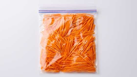 細切りやいちょう切りなどに切り分けて、生のままか、固めにゆでて冷凍用の保存袋に入れて冷凍庫へ。冷凍保存したにんじんは凍ったままで炒め物や汁物の具材にさっと使えます。
