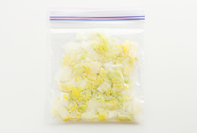 葉はざく切り、軸はそぎ切りや細切りにし、固めにゆでてから保存袋に入れて冷凍庫へ。凍ったまま煮物や汁物などに便利に使えます。