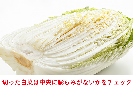 まるごとの白菜を選ぶ場合は葉がしっかりと巻いていて、ずっしりと重いものを選びましょう。切られているものは、切り口が白くてみずみずしいかを確認。また、切った白菜は時間が経つと中央が膨らむため、膨らみ具合から鮮度をチェックできます。