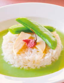 ⑤ ③を切り分けて器に盛り、④をかける。最後に、塩抜きした桜の花の塩漬けをあしらう。