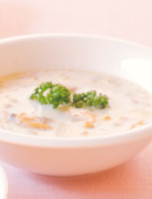 ③ ②に①のじゃがいも、セロリを加えてさらに煮る。具材に火が通ったら、牛乳とむきあさりを加えてさっと煮る。