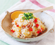 作り方 ① 梅干しは種を取って包丁で細かく叩き、ペースト状にする。ごま油、だし汁と合わせて味を調える。 ② 玉ねぎは薄切りにし、塩少々(材料外)を振って、しばらく置き、水気を絞る。人参は5mm角に切り、茹でる。 ③ じゃがいもは茹でて、皮を剥き、粗くマッシュする。 ④ ③が熱いうちに①と②と、ちりめんじゃこを混ぜ合わせる。 ⑤ 器に盛り付け、小口切りにした万能ねぎを散らす。 調理のPoint 梅干しの味によって、だし汁の量を調整しましょう。材料(4人分) (A) じゃがいも…2個 玉ねぎ…1/4個 人参…30g ちりめんじゃこ…大さじ2 万能ねぎ…適量 梅干し…大2個 ごま油…小さじ1 だし汁(昆布)…小さじ1