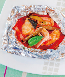 作り方 ① すずきに塩・こしょうで下味をつける。ロースハムは4~5cmの細切りにする。アスパラガスは塩茹でし、斜め切りにする。マッシュルームは薄切りにする。 ② 玉ねぎ、人参、にんにく、バジルはみじん切りにする。 ③ 鍋にオリーブオイルと②のにんにくを入れて弱火にかける。香りがしてきたら、②の玉ねぎ、人参を加えて炒める。しんなりしてきたらコンソメスープ、トマトピューレ、ケチャップを加えてしばらく煮る。②のバジルを加えて塩・こしょうで味を調える。 ④ アルミ箔を広げ、③を薄く塗る。その上に①のすずきを置き、ロースハム、アスパラガス、マッシュルームを乗せ、最後に③を全体にかけてしっかりとアルミ箔で包み込む。200℃に熱したオーブンで約15分焼く。 ⑤ 器に④をのせて、ホイルの口を少し開き、飾り用のバジルを飾る。 調理のPoint 焼き過ぎるとすずきがパサパサになってしまうので注意しましょう。材料(4人分) 飾り用 すずき…4切れ ロースハム…2~3枚 アスパラガス…4本 マッシュルーム…50g 玉ねぎ…1/4個 人参…30g にんにく…1片 バジル(葉)…3枝分 コンソメスープ…150cc オリーブオイル…大さじ2 トマトピューレ…大さじ4 ケチャップ…大さじ2 塩…少々 こしょう…少々 バジル(葉)…4枚