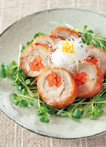 調理のPoint 鶏もも肉は身の方を観音開きにし、平らになるようにしっかり広げましょう。焼くと皮が縮んでしまうので、あまり強く巻き過ぎないように。貝割菜をたくさん使うと、盛り付けも華やかになります。
