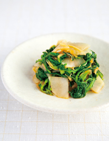 ⑤ 春菊は塩茹でして3~4cmに切り、④の煮汁と絡ませておく。