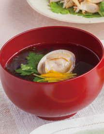 椀に②のはまぐりを入れ、熱々の③を注ぎ入れたのち、三つ葉と千切りにした柚子皮をのせる。
