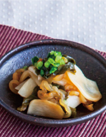 ①かぶは縦半分に切って、薄切りにする。かぶの茎はよく洗い、サッと茹でて小口切りにする。くらげは塩抜きをして、食べやすい大きさに切る。わかめは戻して一口大に切る。