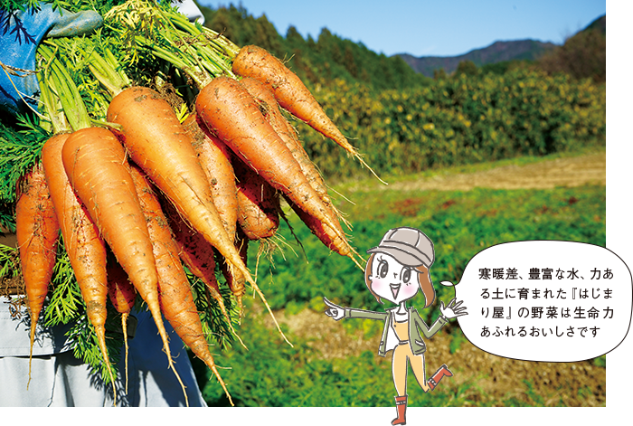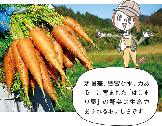 健康や美容のためといっても、おいしくなければ積極的に食べたいと思えませんよね? 有機栽培の安心感に加えて、宇陀ならではの土地の力に育まれた野菜は、味がよいことも自慢です。栽培するのは、にんじん、玉ねぎ、リーフレタスやベビーリーフなど。どれも味がしっかりとしていて、私も初めてにんじんや玉ねぎを食べたとき、「野菜ってこんなに甘味があったんだ!」と驚きました。痩せた土地で育った野菜は味わいが物足りないと言われますが、『はじまり屋』の野菜はとても濃厚。それぞれの持ち味を最大限に活かすため、旬にこだわって栽培しています。