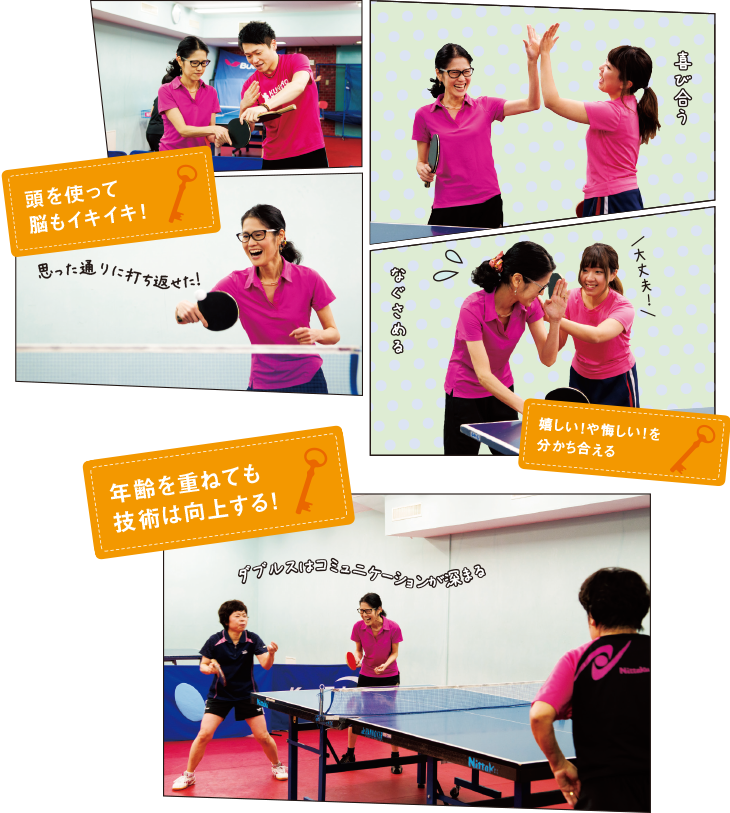 練習を終えた生徒さんたちに卓球の魅力を聞いてみると「歳を取って体力は落ちても技術は上がるのよ!」との言葉。キラキラと輝く彼女の笑顔と自信にあふれた姿に胸が熱くなりました。「年齢を重ねてもさらに輝けるんだ!」と勇気をもらった気分です。ここで練習をしているご婦人方は、さまざまな大会に出ているそう。「仲間と一緒に練習したり、試合に出ると、嬉しさも悔しさも分かち合えて楽しいのよ」「幅広い年代と試合するけど、自分より若い人に勝てると嬉しいし、年上の人を見るとまだまだがんばらなくちゃ! と気合いが入るわ」とのこと。生涯長く楽しめるのも卓球の魅力ですね。私もまずは初心者の大会で表彰台を目指してみようかな!