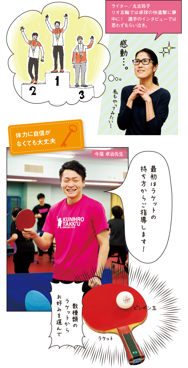 昨夏のリオデジャネイロ五輪での日本選手の目覚ましい活躍で、話題に上ることの多い卓球。温泉宿でゆるいピンポンしか経験のない私ではありますが、トップ選手同士の激しいラリーを見て圧倒されてからというもの、やってみたい! という気持ちがふつふつと湧き上がりました。さっそく、初心者から丁寧に教えてくれる東京・荻窪の『クニヒロ卓球』へ。笑顔が素敵な今福卓治コーチに指導をお願いしました。「卓球は何歳からでも楽しめるスポーツ。健康維持もさることながら、約0.4秒というスピードで、次は右、次は左と連続して飛んでくる球に反応するので、頭の運動にもなりますよ」。教室を見回すと50歳以上と思しきご婦人が多く、カラフルなウエアで熱心に打ち合っています。靴底をキュッキュと鳴らして機敏に動く姿は本当に若い! 活気あふれるエネルギーに元気をもらい、私の挑戦が始まりました。