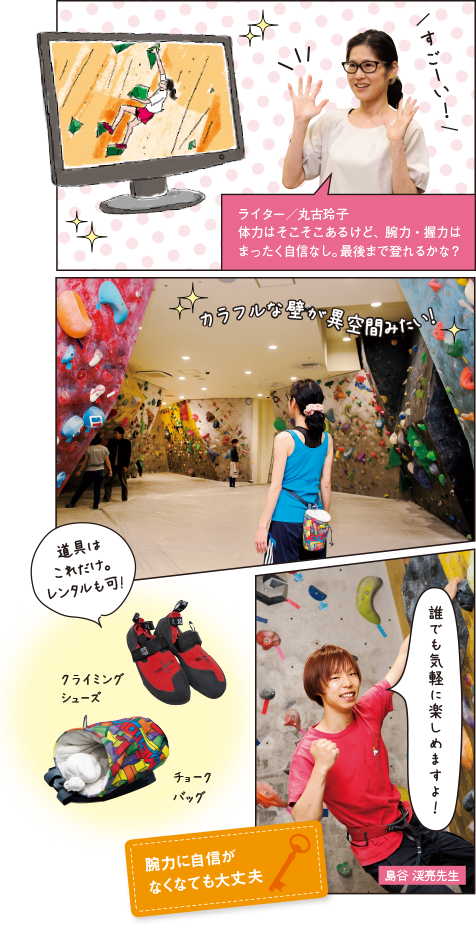 ボルダリングが2020年東京五輪の追加種目に決定したことで興味が湧き始めた頃、ボルダリングの大会では、なんと中学生が大活躍しているというニュースも飛び込んできて、やってみたい! という気持ちがぐんとアップ。高い壁をよじ登るなんて普通の人には絶対無理と思ったけれど、周りに聞くと、数年前からハマっている男性や、「何度かやったことがある」という女性も意外といてびっくり。ボルダリングってそんなに人気なの!? この波に乗り遅れまいと早速、千葉・船橋の『グラビティリサーチTOKYO-BAY』へ行きました。カラフルな壁にさまざまな石がボコボコ出ているのを見るだけで「できるかな?」と、思った以上に高い壁を前にドキドキ。「ボルダリングはフリークライミングの一種。3〜5mほどの壁を、道具を使わず自分の力だけで登ります。どの石(ホールド)を使ってゴールまでたどり着くか自分の頭で考えて、身体で答え合わせしていくのがおもしろいですよ」と島谷渓亮先生。ホールドに手をかけ両足も乗せて、さっそく床から“離陸”します!