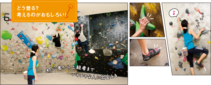 「腕力はそれほどいりません。肩の力を抜いてみて」と先生。ホールドにしがみつかずふわっと身体を離し、ぶら下がる要領でバランスを取るのがコツだそう。やってみると確かにラク! 力を使うのは、ひとつ先のホールドに手をかけ身体をグッと引き寄せる一瞬。あとは、上へ上への体重移動だと意識すると、おもしろいくらいひょいひょい登れ、楽しくなってきました。「ナイスです!」の声がまた嬉しい。初心者コースをクリアした私は次のレベルに挑戦。すると、途中で次の手がわからなくなり立ち往生! その時、「次は右上、手を伸ばして!」「ガンバッ!」。先生だけでなく、練習していたほかの人たちからも声援が聞こえました。勇気が湧いて次のホールドを見事にキャッチ。サポートがなければあきらめていたかも。応援のありがたさが身に沁みる! 3mの頂上で味わう達成感はひとしおでした。まるで頂点を目指して無心でジャングルジムに登っていた子どもの頃にタイムスリップしたよう。