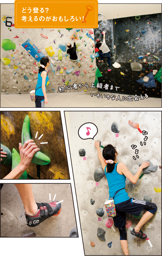 クライミングシューズとチョークバッグはレンタルもできるので、動きやすい服装があればOK。個人練習だから好きな時間に行って好きなだけできる点も、ボルダリングが始めやすく続けやすい理由です。「週2回、来ると5〜6時間はいます」と常連の女性。ここでできた仲間と目標に向かって励まし合うのはもちろん、「何か月も取れなかったホールドがやっと取れた喜びはたまらない」と、自分の限界への挑戦と突破のおもしろさに夢中だそう。この楽しさを知ったからには、五輪の応援にいっそう熱が入ること間違いなしです!