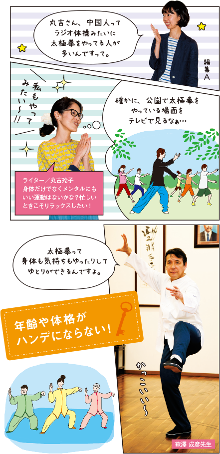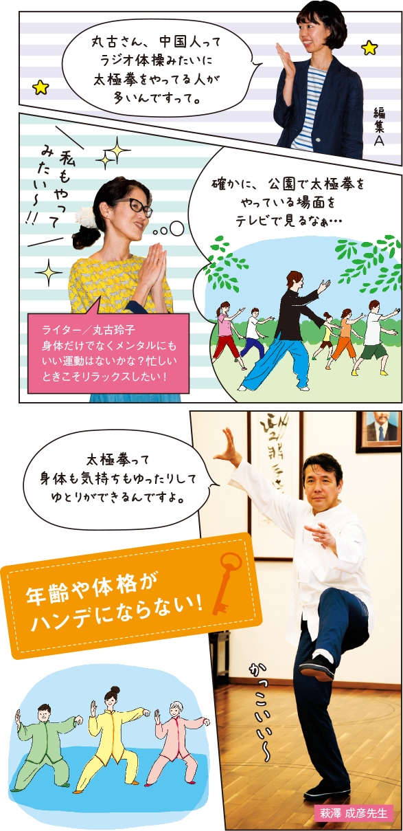 先日、ご主人が中国人だという編集Aからこんな話を聞きました。「中国では若者もお年寄りも太極拳を気軽にやっているんですって。主人の親戚も日課にしているそうなんです」。中国では本当に多くの人が太極拳をやっていて、日本でいうラジオ体操のように国民的な運動であるらしい。へえ、そうなんだ!