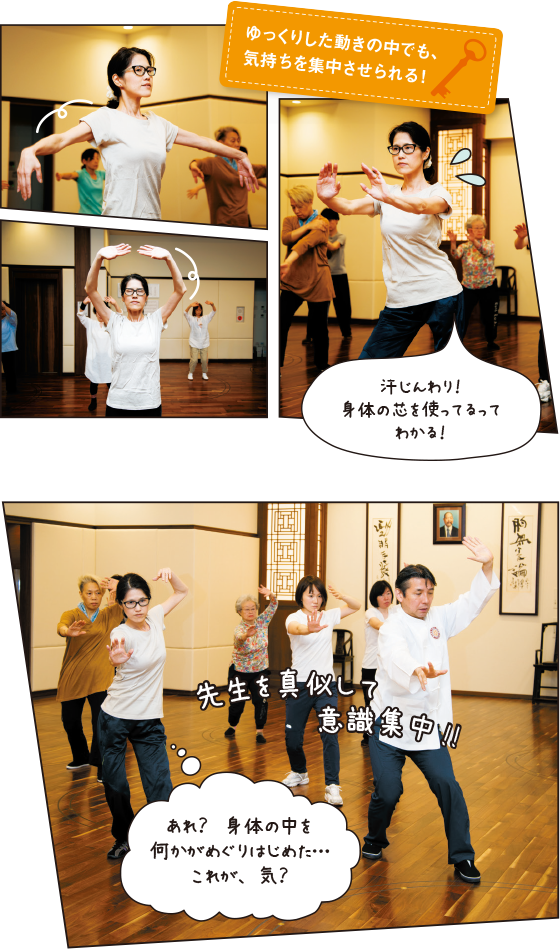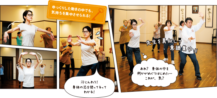 「粘土をゆっくり伸ばすように動きましょう。急ぐとちぎれてしまいますからね」と先生。なるほど。言われたことをイメージしながらじっくり動くと、次第に呼吸が深まり、じんわり汗がにじんできました。先生の真似をするだけで必死ですが、流れるような動作は優雅な舞いのようであり、時折出てくる武術的なポーズもカッコいい!「ゆったりしているのに常に身体のどこかが動いているのがおもしろい。はじめは自分の足と腕がこんなにも動かせないものかと驚いたけど、何度も通って繰り返すうちに動きがなめらかになって、どんどん惹き込まれて」と言う生徒さんも。皆さん自分の身体を愛しむように気持ちよさそうで、動きにまったく無理がありません。「力まずゆるめてほぐす感じで」と先生。このように力を抜いた状態で筋肉を使う運動は太極拳ならではなのだとか。だからこそ、日常の無意識な力みや緊張から解放され、本来の自分に向き合える。がんばるのも大事だけど、ときには心身をゆるめることが必要なんですね。