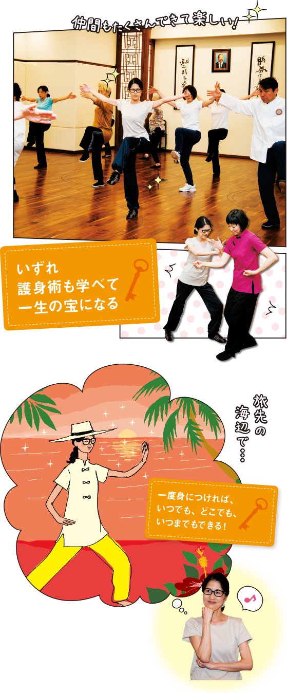 太極拳はかつて中国の皇帝も学んだという伝統ある武術で、気の力を利用して相手を制する護身術でもあるそう。力に力で対抗せず、軽やかにかわして身を守る術であり、だからこそ力の弱い女性も修得しやすい。太極拳を身につけ自分を守れる強さを持てば、凛とした魅力も出てきそうです。基本さえ覚えれば、いつでもどこでも身体一つあればできるのも太極拳のいいところ。例えば、旅先で素敵な自然や美味しい空気の中で身体を動かしたくなったとき、靴やウエアや道具の準備もいらず、思い立ったらその場ですぐにできます。気持ちよさは格別! これは一生の宝物ですね。
