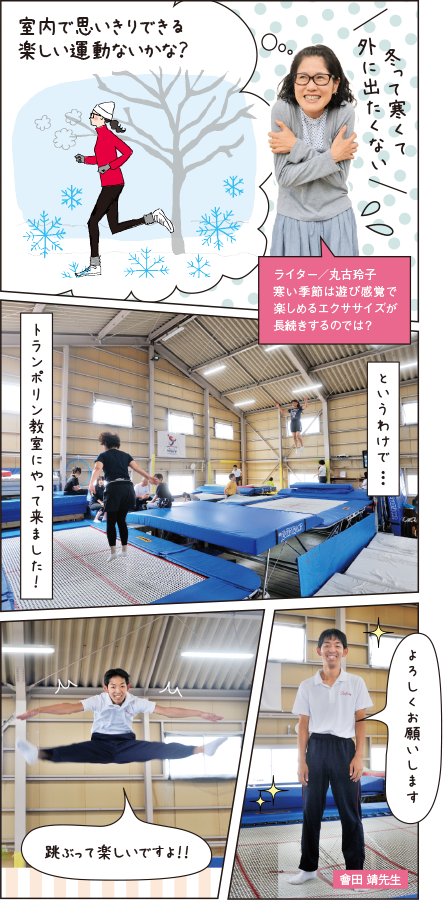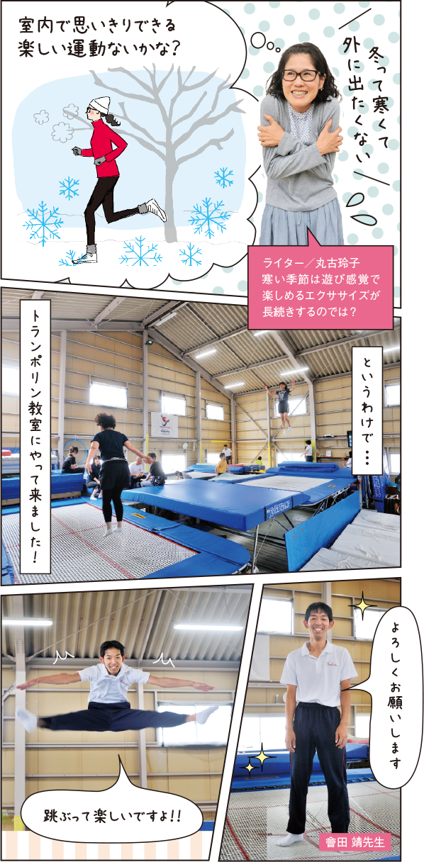 皆さんは夏と冬のどちらが好きですか? 私は断然夏派で、寒くなると身体を動かすことも、外に出ることも少なくなります。でも、年末年始はおいしいものをたくさん食べる機会が多いので、やはり運動不足は気になります。そこで、室内でも外で運動するのと同じぐらい汗をたっぷりかける運動を見つけたい。そう思って探し始めたとき、テレビで五輪競技のひとつとしてトランポリンが紹介されているのを見ました。高く跳んで繰り出す技がカッコいい。私も跳んでみたい! と思い、東京・足立区の『スポーツクラブ テン・フォーティー足立店』へ。會田 靖先生によると、「トランポリンは1分跳んだら、400メートルを全速力で走るのと同じ運動量なんです」とのこと。室内でそんなに運動できるとは驚き! 冬もしっかり運動したい人にぴったりです。性別、年齢、経験を問わず集まる生徒さんの中には、50代で本格的に始めた人や、65歳で大会を目指す人も。皆さんをそこまで夢中にさせる魅力って何だろう。ますますワクワクしてきます。