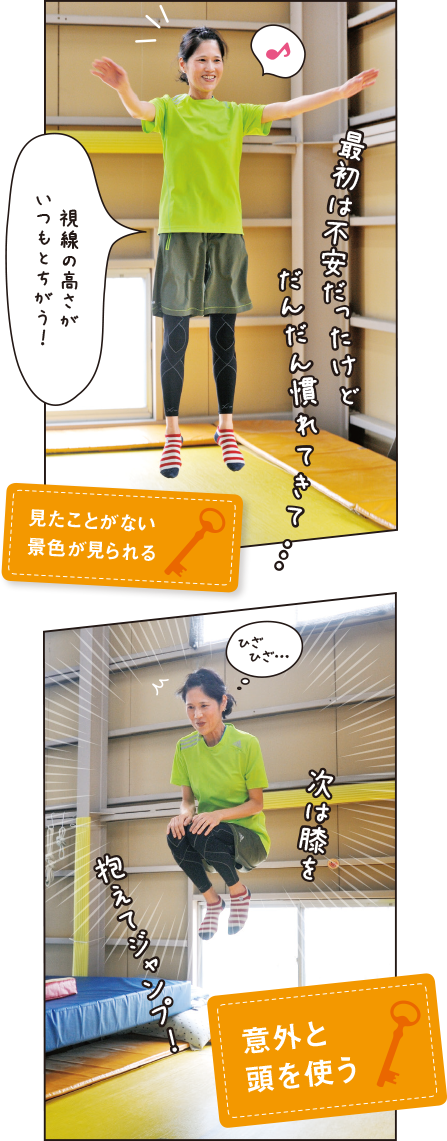 「自力でジャンプする時は膝を曲げますが、反動で跳ぶトランポリンは、逆に膝を伸ばすのがコツ。力まずポーンポーンと反動のリズムに身をゆだねて」と先生。さっそくピョンッと跳ねました。身体がふわりと宙に浮く感覚が不思議です。次第に高くジャンプできるようになり、目線が上がっていくと……、おもしろい! 初めて目にする高い場所からの眺めに、自然と笑っていました。子どもは飛び跳ねて喜びを表現しますが、そんな童心が一気によみがえる。跳ぶこと自体が楽しくて、だんだん嬉しくなっていくのです。「くるりと回ってみましょう」と先生。最初は無理だと思いましたが、「できないと思うことができるようになるのもトランポリンのおもしろさですよ」。やってみるとその通り、「できた!」の達成感で、ますますやる気が出ました。「膝を抱えて」「次は後ろ向き」という先生の声に合わせ、とっさに身体を反応させるには意外と頭を使います。「頭でわかっていても身体がついていかない悔しさがあるから、成功を目指して続けられる」と生徒さん。なるほど。頭と身体の連動もトランポリンの魅力なのですね。「体力に自信がついて気持ちも若返る」「真っ直ぐ跳ぶ練習で体幹が鍛えられ、普段の姿勢もよくなった」という声や、「アドバイスし合える仲間とワイワイするのが楽しくて」と、個人競技でありながら連帯感が味わえるのもいいところだそう。
