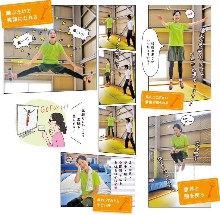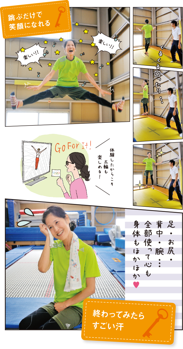 レッスン終了が残念なほど、もっと跳びたかった。汗もたくさんかいて爽快な疲労感がありました。自分で体験したからこそ、五輪競技のトランポリンも楽しみ。たくさん笑えて心まですっきりできたことも大収穫です!