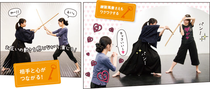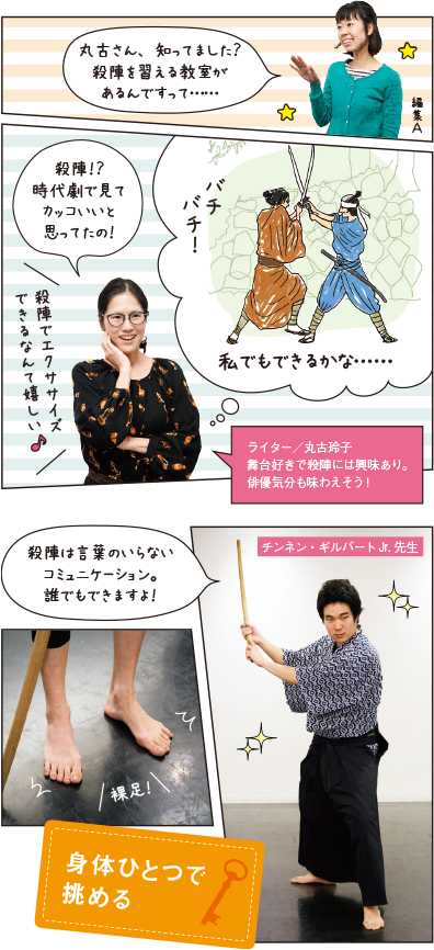 「身体ひとつあれば楽しめるのが殺陣。相手と呼吸を合わせて、言葉なしでコミュニケーションできるようになるのも魅力です」とチンネン・ギルバートJr.先生。ベテラン生徒さんの中には袴姿の人もいて、とても本格的。複雑な動きも相手と阿吽の呼吸でこなし、流れるようなスピード感もあってカッコいい! 体験しに来たことを忘れてしまうほど、練習風景に見とれてしまいました。