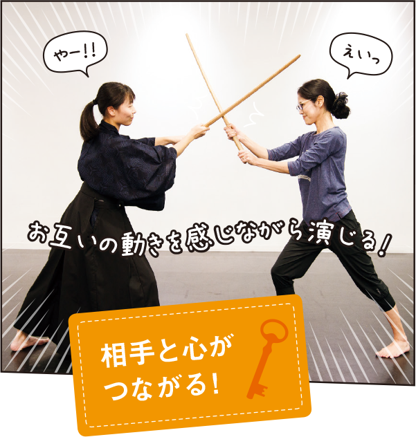 お腹の前で木刀を構える正眼の構え。そこから、頭上に振り上げ、真正面に振り下ろす真向斬り。まったくの初心者なのに、先生の号令に合わせるだけで、時代劇で見たままのポーズができました。専門用語が学べるのもおもしろく、どんどん気分がノッていきます。悪党を退治する気持ちで木刀を振り下ろすと、相手はさっと身をかわす。お互いケガのないように本気になるので、木刀を構えて向き合えば、一瞬で凛とした表情に変わります。ドキリとするほど鋭いまなざしで、タイミングを感じ合う。初めはかけ声がないと不安でしたが、次第に視線や表情、しぐさで動きを感じ、相手を信じられるようになりました。「今だ!」と動き出し、見事に息が合ったときの達成感は最高。鋭い表情から一転、パッと笑顔になって微笑み合えるのも嬉しい! 言葉なしでも心でつながれた実感がありました。