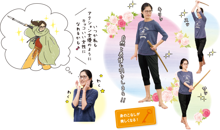 時代劇や歴史が好きで習い始めた女性の生徒さんからは「姿勢がよくなった」との声も。そういえば、皆さん稽古中だけでなく休憩中の所作もスッスッとしなやかできれい。「殺陣を始めてから、その場の空気が読めるようになり、コミュニケーション力が上がった」「人の話を粘り強く聞けるようになった」という声には、そんな効果があるとは意外! と驚きました。でも目と目で通じ合う経験をした後なので、なるほど、と納得もできます。日常的な所作をカッコよくしたい女性たちから殺陣にハマった70代男性まで、みんな一緒に“サムライ”になりきって交流できることも、楽しく続けられる理由だそう。時代劇の俳優気分で楽しみながら、身体だけでなくココロにも変化が期待できる殺陣エクササイズ。私も改めて内面から強く美しくなりたいと思いました!
