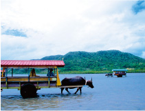 かつて西表島で農耕を行う人々の居住地として繁栄した由布島では、田を耕したり海を渡ったりする手段として、各家で水牛を飼っていました。当時の様子そのままの由布島行き水牛車で、15分ほどかけて浅瀬を渡ります。周囲約2kmの由布島は島全体が亜熱帯の植物園になっています。