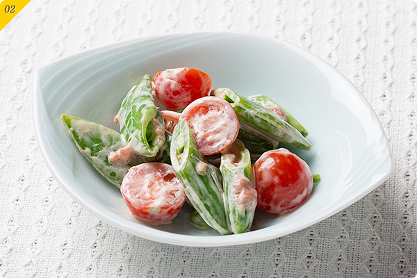 トマトとスナップエンドウの梅マヨあえ(2食分)